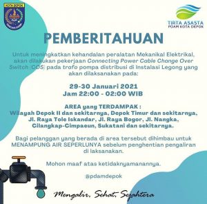 “Akan ada pekerjaan connecting power cable change over switch (COS) pada trafo pompa distribusi di instalasi Legong,” ujar Direktur Umum PDAM Tirta Asasta Kota Depok, Ade Dikdik Isnandar, Jumat (29/1/2021).