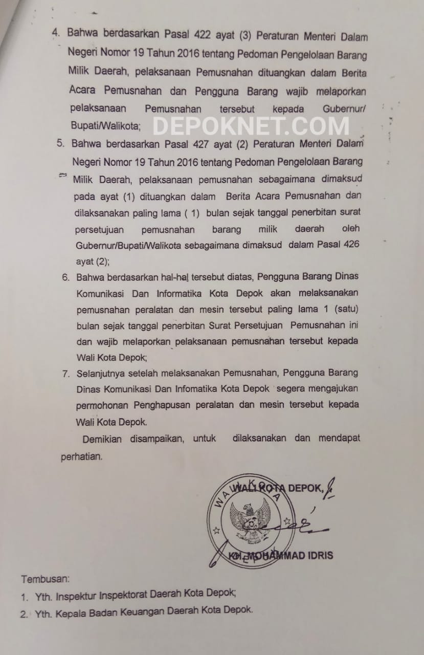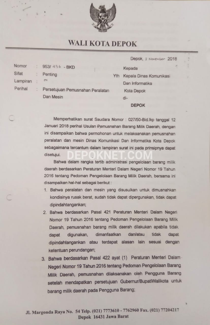 Surat persetujuan Walikota Depok perihal persetujuan pemusnahan peralatan dan mesin itu diterbitkan 2 November 2018 dengan nomor surat 953/436-BKD ditujukan kepada Kepala Dinas Kominfo kota Depok.