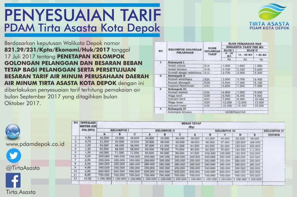 Keputusan penyesuaian tarif PDAM Kota Depok ini berdasarkan Surat Keputusan Walikota Depok Nomor 821.29/231/Kota/Ekonomi/Huk/2017 tertanggal 17 Juli 2017 tentang Penetapan Kelompok Golongan Pelanggan Dan Besaran Beban Tetap Bagi Pelanggan Serta Persetujuan Besaran Tarif Air Minum Perusahaan Daerah Air Minum Tirta Asasta Kota Depok.