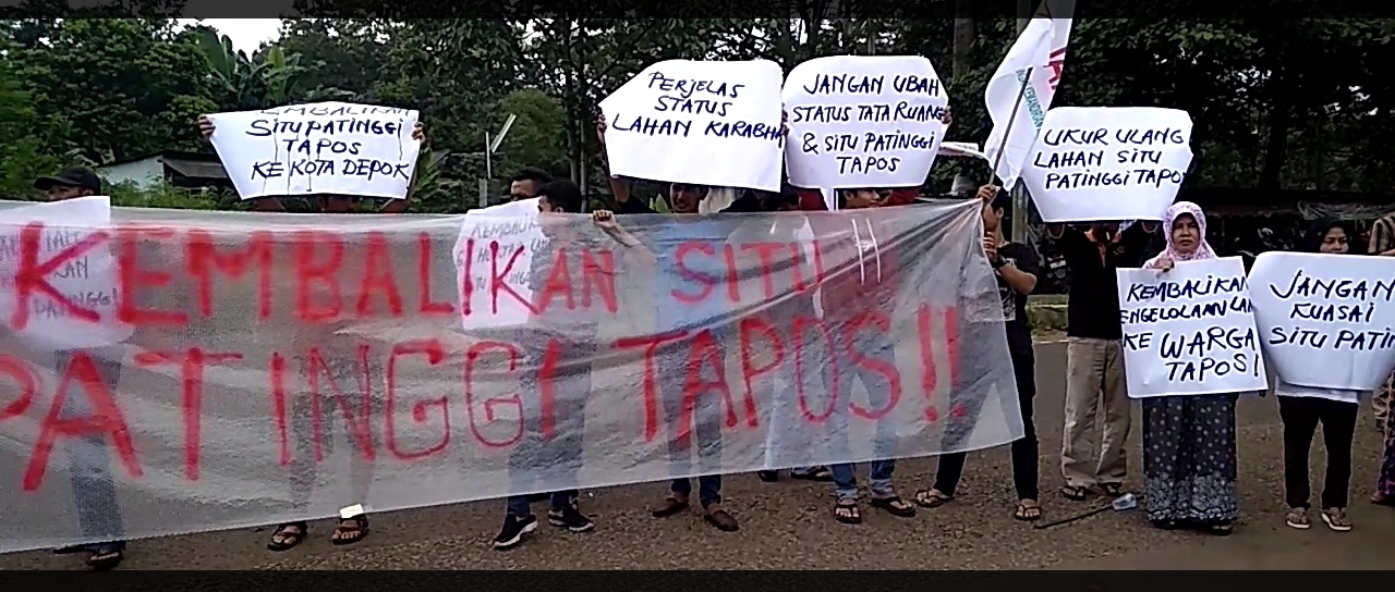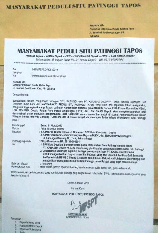 Mengusung 9 tuntutan, MPSPT menyebut keberadaan Situ Patinggi yang berada dalam area padang Golf Emeralda, Kecamatan Tapos merupakan Suatu Aset Pemerintah yang saat ini sedang dikuasai oleh Korporasi/Swasta diduga tanpa legalitas yang jelas.