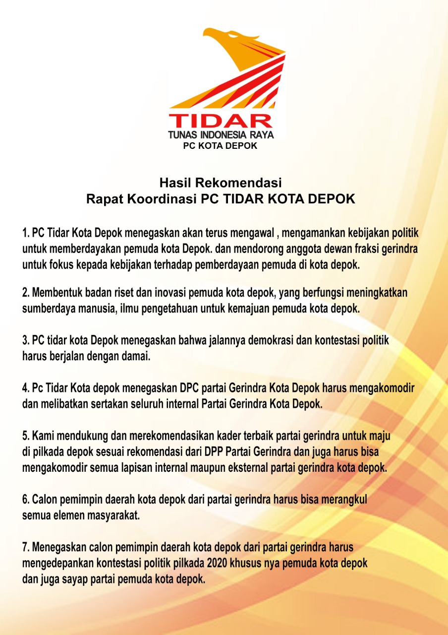 4. Pc Tidar Kota depok menegaskan DPC partai Gerindra Kota Depok harus mengakomodir dan melibatkan sertakan seluruh internal Partai Gerindra Kota Depok.