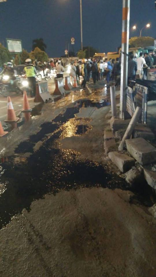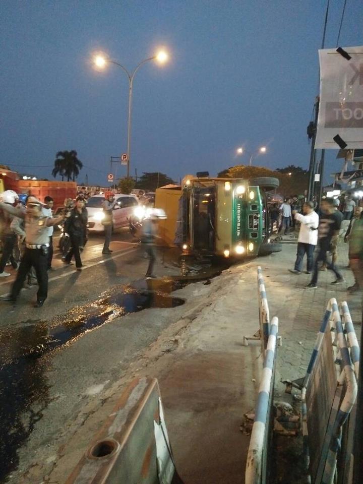 Kejadian terbaliknya truk ini terjadi pukul 18:00 WIB yang menyebabkan ruas pertigaan jalan Juanda – margonda khususnya dari arah Juanda ke Margonda menjadi macet total. Tampak aliran solar mengalir dari truk yang terbalik tersebut, yang ditakutkan akan membahayakan bagi pengguna jalan yang melintas di sekitar lokasi kecelakaan. Aparat Polantas pun cukup kelimpungan mengamankan area kejadian karena terjadi di jam sibuk dan padat kendaraan. Tak ada korban jiwa dalam kejadian ini, namun ada sekitar tiga unit motor yang tertimpa truk ini saat terbalik. (pengirim Yogi) |