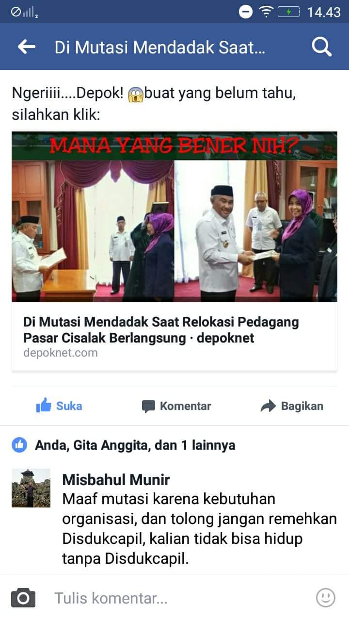 Hal ini terlihat dari komentar yang diduga disampaikan oleh Kepala Dinas Kependudukan Dan Catatan Sipil (Disdukcapil) Kota Depok, Mumun Misbahul Munir, SH di salah satu akun Facebook yang memposting berita mutasi dadakan tersebut. (Baca : http://www.depoknet.com/di-mutasi-mendadak-saat-relokasi-pedagang-pasar-cisalak-berlangsung/)