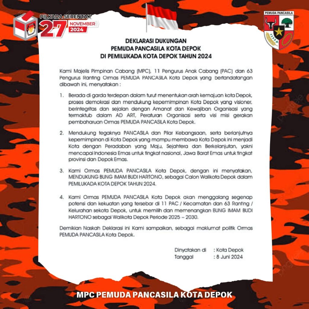 “Kami Pemuda Pancasila Kota Depok, dengan ini menyatakan, mendukung Bung Imam Budi Hartono, sebagai Calon Walikota Depok dalam Pemilukada kota Depok tahun 2024,” demikian bunyi naskah deklarasi yang lantang dibacakan Sekretaris MPC Pemuda Pancasila kota Depok, Eric Yansen Sihotang.